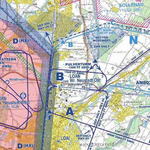 BestellenLuftfahrtkarte Österreich mit relevanten Lufträumen und Flugverkehrszonen.